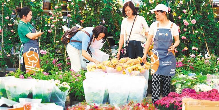 ▶4月24日,成都市郫都区春天花乐园,游客在选购花卉。春天花乐园有花卉、绿植、资材等产品超3万种,成都世园会的举办让园区新增了多家全球花卉头部企业入驻。