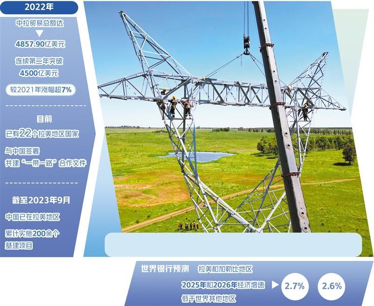 共建“一带一路”合作在拉美持续推进,目前已有22个拉美地区国家与中国签署共建“一带一路”合作文件。中拉双方在基础设施建设方面取得重大突破。截至2023年9月,中国已在拉美地区累计实施200余个基建项目,承建了上千公里道路、铁路、轻轨,100多所学校、医院、体育场馆,近百座桥梁、隧道,数十个机场、港口,为当地提供近百万个就业岗位。在这一合作框架下,中国对拉美投资也日益多元,不断向清洁能源、数字经济、高端制造、卫生健康等新兴领域拓展。