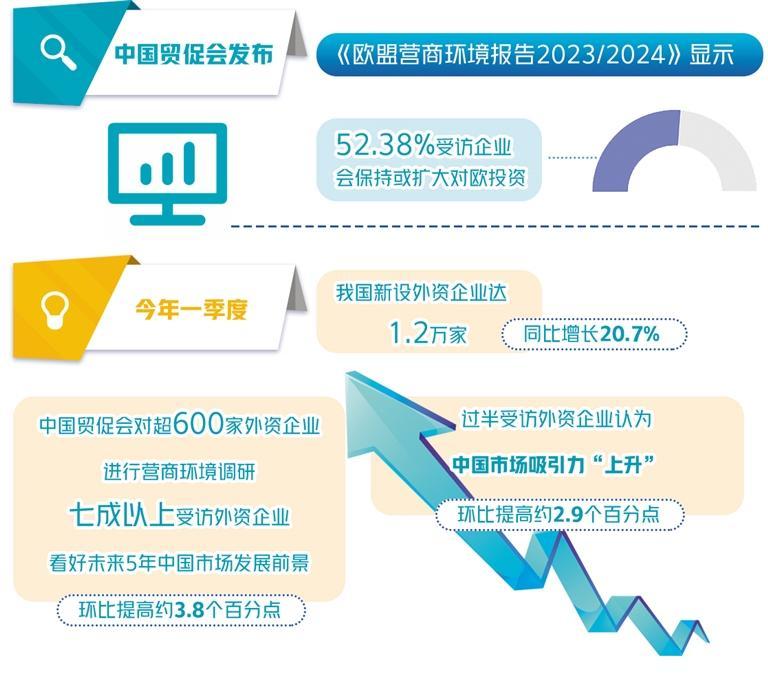 4月28日,中国贸促会发布《欧盟营商环境报告2023/2024》显示,过去一年,中欧双边经贸合作呈现巩固发展的良好势头,52.38%的受访企业表示,会保持或扩大对欧投资。
