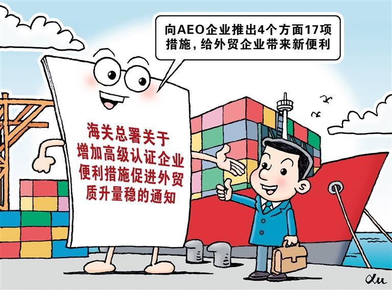 日前发布的《海关总署关于增加高级认证企业便利措施促进外贸质升量稳的通知》,在原有管理措施基础上,向高级认证企业(AEO企业)推出4个方面17项措施。AEO被称作全球贸易的一张“绿色通行证”。有了它,企业通关可以“捷足先登”,贸易成本又能“胜人一筹”。作为海关最高信用等级企业,AEO企业可以享受优先办理、减少监管频次、优化服务等一系列优惠管理措施,有效降低企业国际贸易成本,提升国际竞争力。有关部门要不断加大AEO企业培育力度,尤其加强对专精特新“小巨人”企业、单项冠军企业等培育力度,扩大AEO企业范围;持续提升AEO企业含金量,扩大AEO企业享惠覆盖面;进一步扩大AEO互认国家(地区)数量。