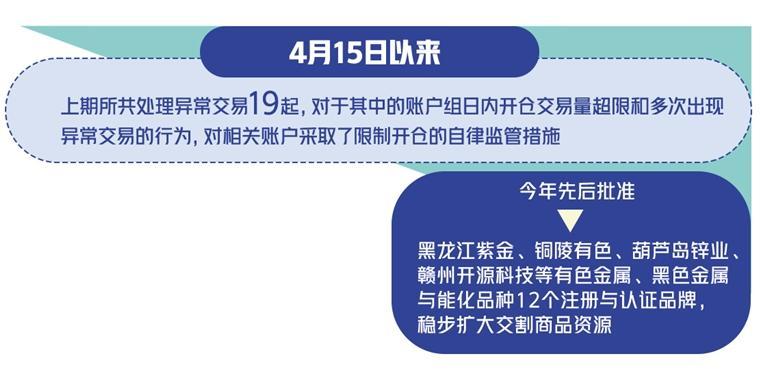 二是保持高压监管态势,坚决维护市场秩序。强化监控力度,严查违法违规行为,加强实控排查,及时开展重点客户约谈,做好对会员客户的风险提示工作。4月15日以来,上期所共处理异常交易19起,对于其中的账户组日内开仓交易量超限和多次出现异常交易的行为,对相关账户采取了限制开仓的自律监管措施。