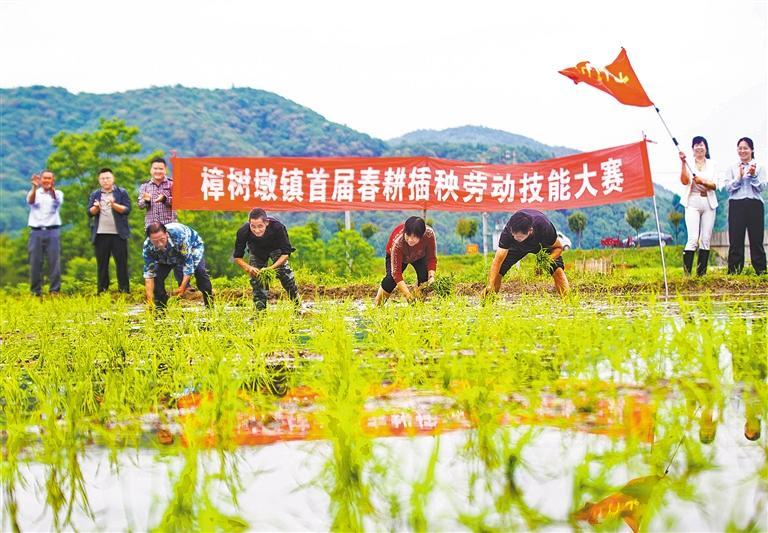 ▲4月30日,江西省弋阳县樟树墩镇举办春耕插秧劳动技能大赛。选手在稻田里上演一场“速度与激情”大比拼。