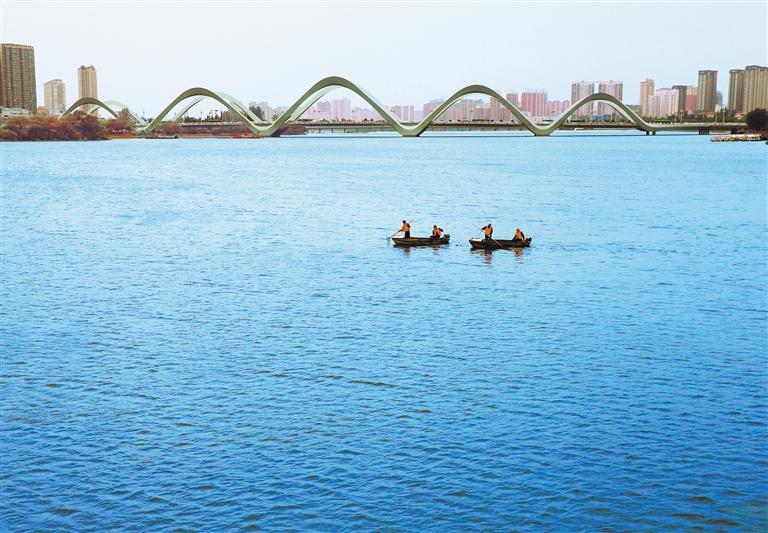 ▼4月30日,河南省南阳市白河国家城市湿地公园,工人在打捞河面上的漂浮物。高 嵩摄(中经视觉)