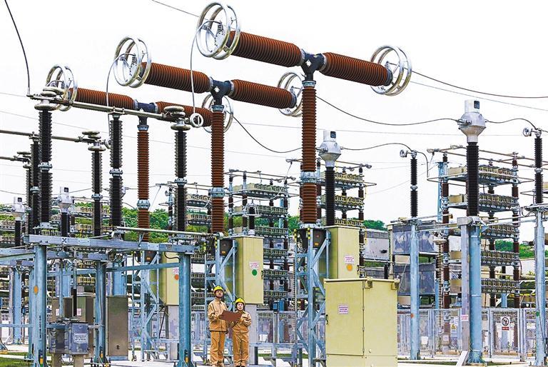 ▼4月30日,工作人员在国内首个“交改直”输电工程江苏镇江±200千伏圌山换流站巡视电气设备运行情况。