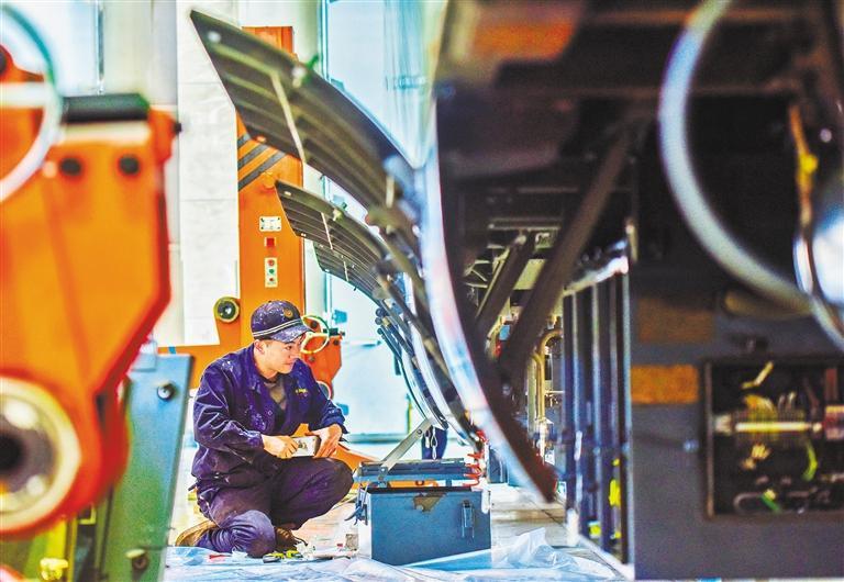 ◀4月30日,中国铁路太原局集团有限公司高铁机械师对动车组制动系统进行检修维护,确保运输安全。