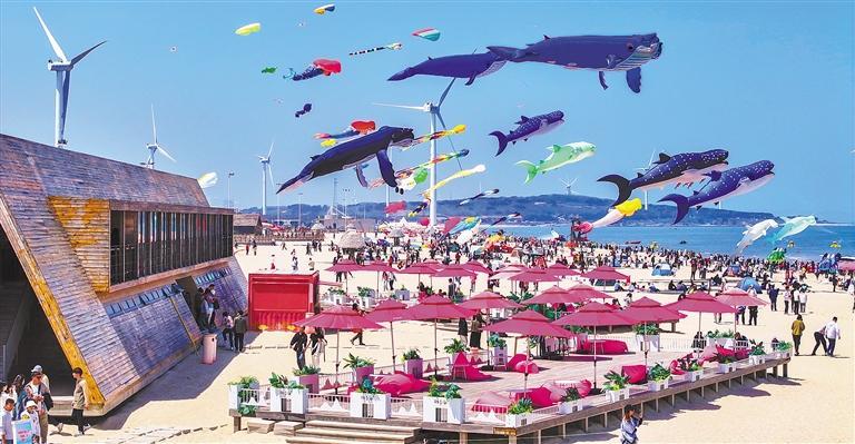 ◀5月1日,山东省荣成市那香海景区,游客在观看风筝表演。