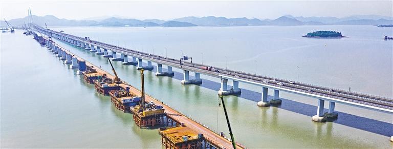 5月2日,浙江省宁波市象山港铁路跨海大桥施工现场,建设工人抢抓晴好天气,稳步推进项目进度。象山港跨海大桥全长8.26公里,是国内首座市域(郊)铁路跨海大桥。蒋晓东摄(中经视觉)