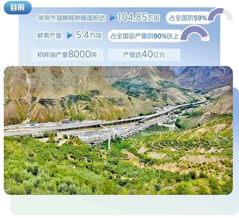 祁大强所言不虚。目前,陇南市油橄榄种植面积达104.85万亩,占全国的59%;鲜果产量5.4万吨,占全国总产量的90%以上;初榨油产量8000吨,产值达40亿元。