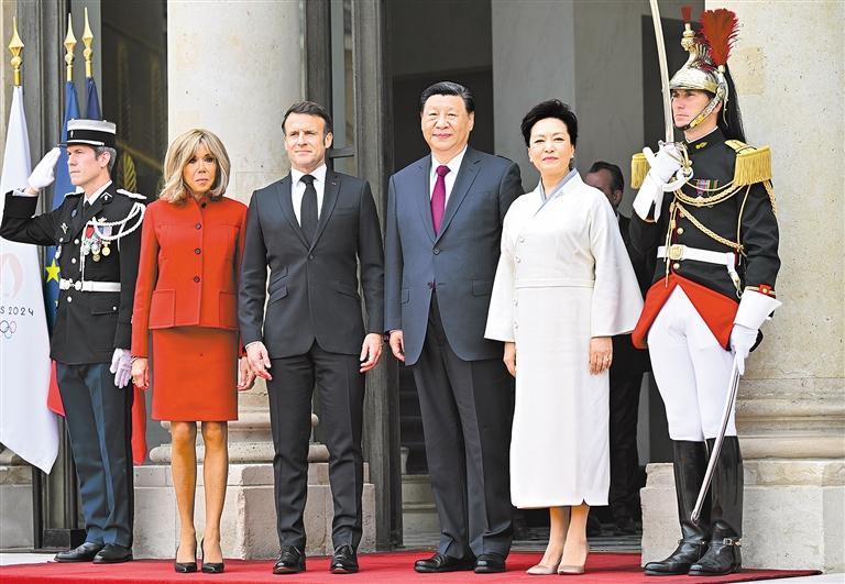 当晚,马克龙和夫人布丽吉特在爱丽舍宫为习近平和彭丽媛举行盛大欢迎晚宴。