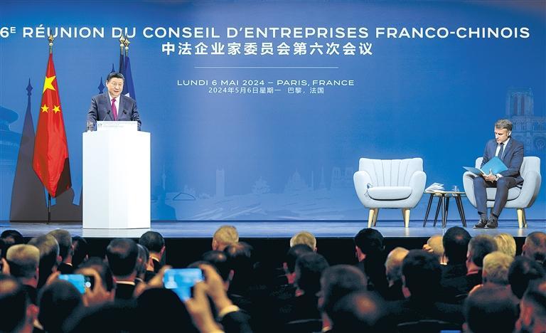 当地时间五月六日下午,国家主席习近平在巴黎同法国总统马克龙共同出席中法企业家委员会第六次会议闭幕式,并发表题为《继往开来,携手开创中法合作新时代》的重要致辞。新华社记者 翟健岚摄