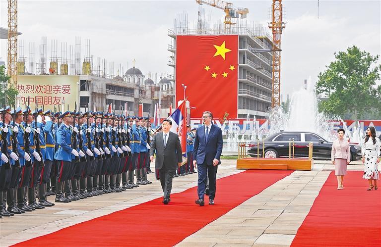 5月的贝尔格莱德,阳光明媚。塞尔维亚大厦前,中塞两国国旗迎风飘扬,仪仗队威武雄壮。习近平和夫人彭丽媛乘车抵达时,塞尔维亚总统武契奇和夫人塔玛拉在下车处热情迎接。