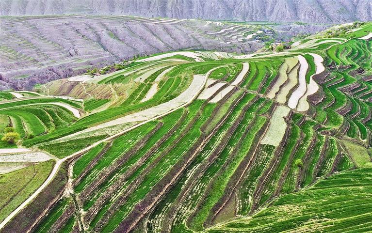 5月11日,甘肃省白银市会宁县会师镇梯田层层叠叠,阡陌纵横。当地近年来因地制宜整治撂荒土地,提高耕地利用率,万亩撂荒地变身致富田。