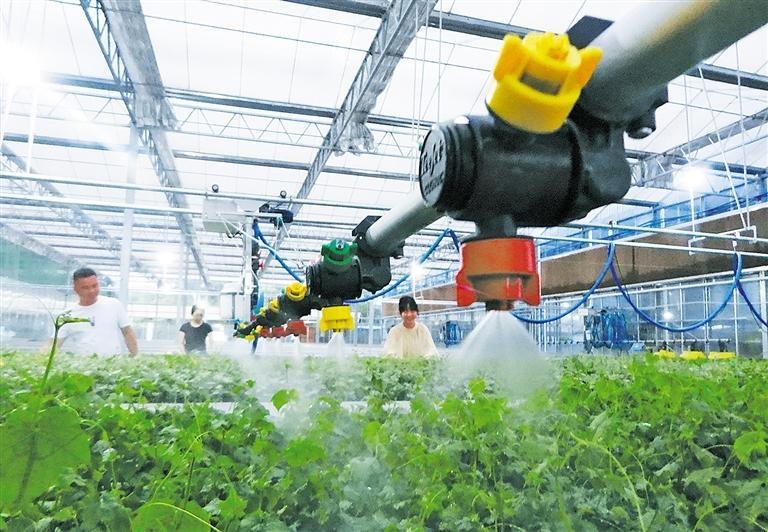 5月8日,四川省达州市达川区双庙镇二东村现代农业园区的数字育苗工厂,技术员在进行丝瓜秧喷淋作业。近年来,达州市积极探索丘陵山区条件下数字乡村发展路径和方法,有力促进农民增收。邓良奎摄(中经视觉)