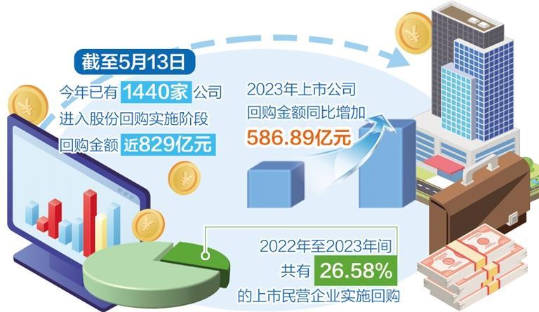 A股上市公司股份回购热持续升温。Wind数据显示,截至5月13日,今年已有1440家公司进入股份回购实施阶段,合计回购金额近829亿元,远超去年同期的247亿元。中国上市公司协会数据显示,2023年上市公司回购金额同比增加586.89亿元,增长108.82%。