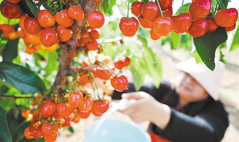 ▶5月13日,山东省郯城县薛城后村村民在采摘樱桃。