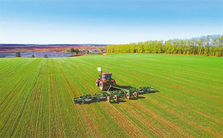 ▶5月9日,北大荒集团建设农场有限公司组织大马力机车进行小麦压青苗作业。