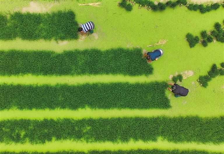 ◀5月12日,重庆市秀山土家族苗族自治县洪安镇农民在田里拔秧。
