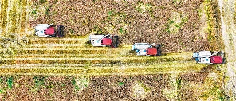 ▼5月5日,四川省成都市双流区彭镇鲢鱼社区,村民驾驶收割机抢收小麦。