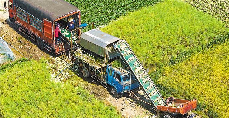 ◀5月9日,江苏省泰州市姜堰区顾高镇顾高村,种植户将采收的萝卜进行清洗装车。