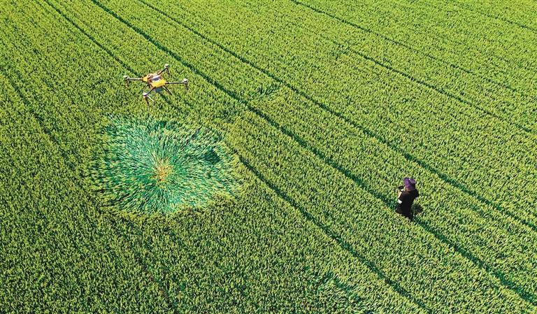 ◀5月13日,河南省温县番田镇三张伦村,农民操作无人机在麦田开展“一喷三防”作业。