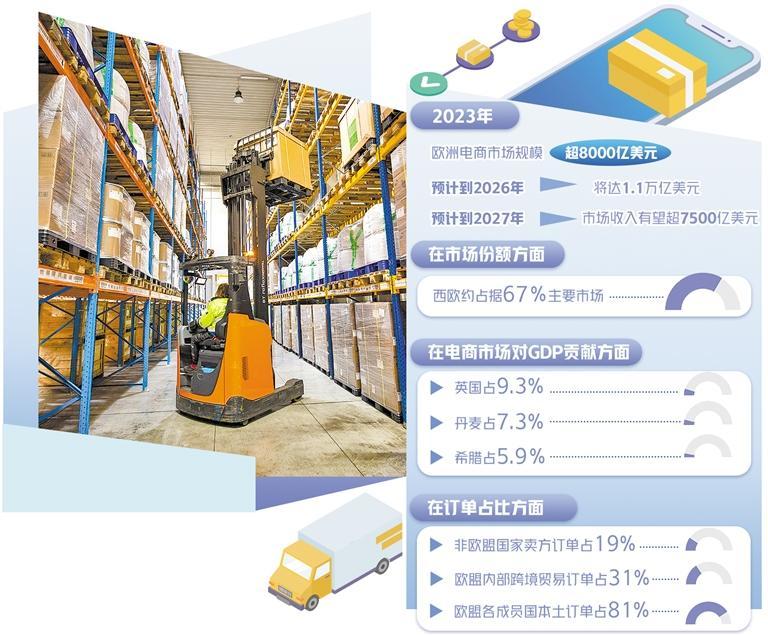 当前,欧洲电商市场呈现出巨大潜力和韧性。据业内研究机构统计,2023年,欧洲电商市场规模超过8000亿美元,预计到2026年将达1.1万亿美元,同时,市场收入到2027年有望超过7500亿美元。总体而言,欧洲电商市场交易额将持续增长。在增长率方面,东欧国家表现优于许多西欧国家;在市场份额方面,西欧约占67%的主要市场;在对国内生产总值(GDP)的贡献方面,英国的电商市场占其GDP的9.3%,丹麦、希腊和瑞典等国虽然市场规模相对较小,但在GDP的占比中,分别达到7.3%、5.9%和5.8%;在订单占比方面,非欧盟国家卖方的订单占比为19%,欧盟内部跨境贸易订单占比为31%,欧盟各成员国的本土订单则占比81%。