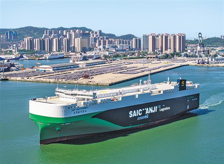 近日,由中集来福士为国内车企建造的清洁能源滚装船“上汽安吉长和”轮在山东港口烟台港正式交付并首航发运。该船总长199.9米,额定装载量为7000车,以清洁环保的液化天然气为主要燃料,是新一代环保型船舶。张 超摄(中经视觉)