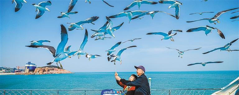 ▼5月9日,山东省荣成市海驴岛海域的一艘游艇上,游客与黑尾鸥亲密互动。