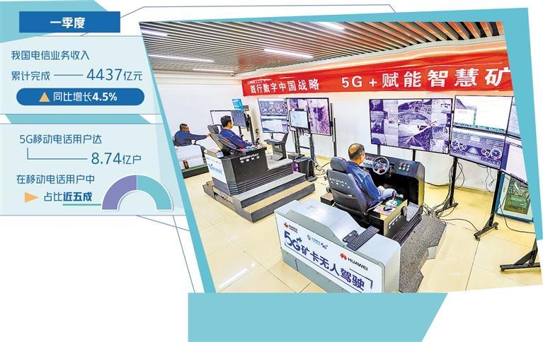 今年一季度,我国电信业务收入累计完成4437亿元,同比增长4.5%。5G移动电话用户达8.74亿户,在移动电话用户中占比近五成;5G基站总数达364.7万个,占移动基站总数的30.6%。云计算等新兴业务拉动作用加大,5G、千兆光网等新型基础设施建设不断推进。