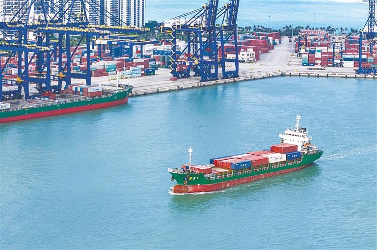 日前,在海口秀英港集装箱码头,满载集装箱的货轮有序离港。今年前4个月,海口市货物贸易进出口总值为262.8亿元,占同期海南外贸进出口总值的29.9%。苏弼坤摄(中经视觉)