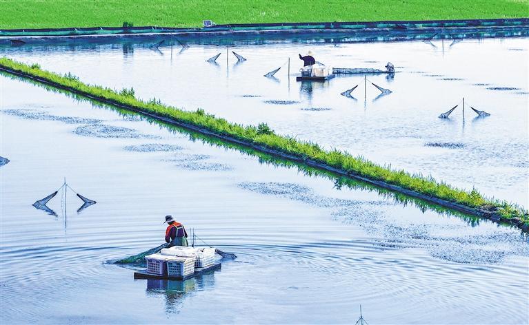▶5月20日,安徽省芜湖市繁昌区平铺镇新塘村,农户在捕捞小龙虾。稻虾套养模式帮助村民实现“一水双收”。