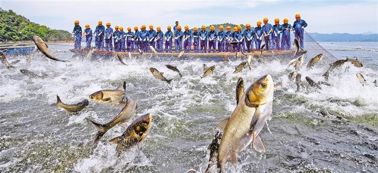 ▼5月15日,浙江省淳安县千岛湖,捕捞队员合力拉网,捕获生态鱼。