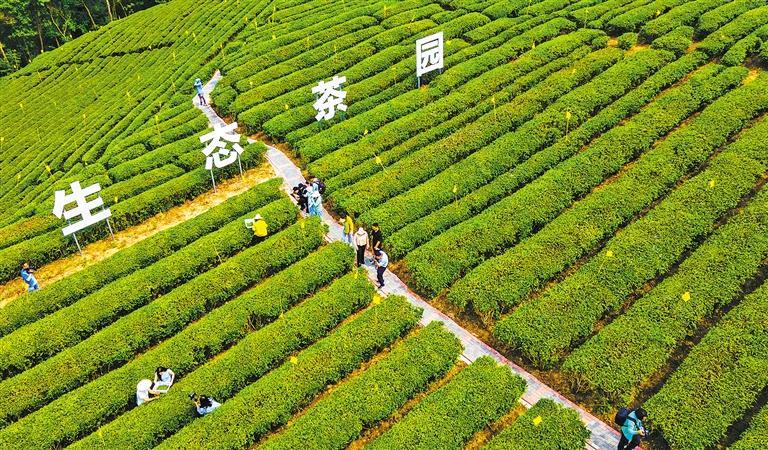 ◀5月17日,游客在陕西省勉县沔水春生态茶园游览。