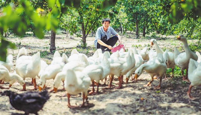 ▼5月20日,河南省睢县尤吉屯乡刘营村金杏采摘园,养殖户在喂鹅。当地采用良性生态循环饲养方式,可提高禽、果的产量和品质,增加农民收入。