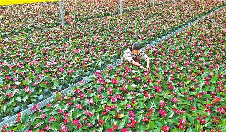 ▶5月11日,山东省东营市东营区现代高效农业产业园,员工对红掌进行日常管理。