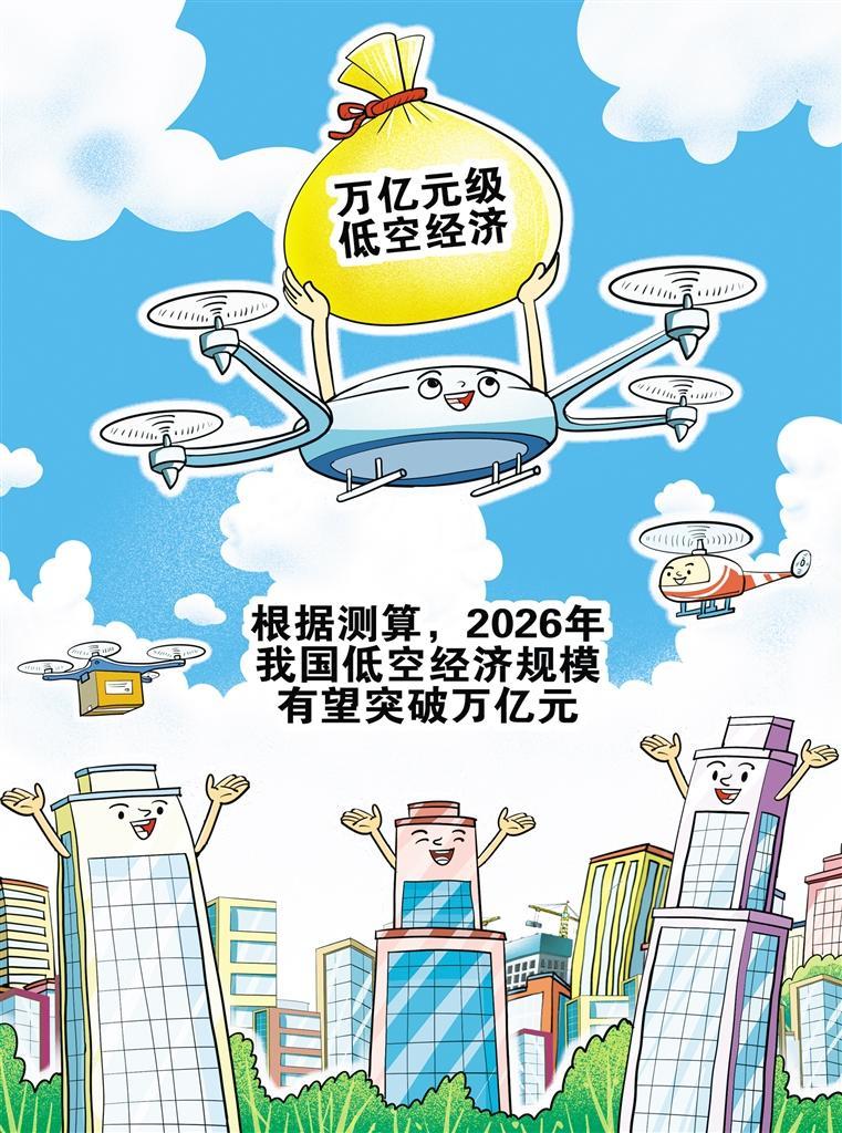 作为全球竞逐的战略性新兴产业,今年首次写入《政府工作报告》的低空经济正加快融入各行各业,深刻改变人们的生产生活,市场规模不断壮大。据测算,2026年我国低空经济规模有望突破万亿元。低空经济是以有人驾驶和无人驾驶航空器的低空飞行活动为牵引,辐射带动相关领域融合发展的综合性经济形态,具有成长性高、产业融合性强、产业链条长、应用辐射面广的特征,蕴含着巨大投资价值和增长潜力,对城市建设和区域产业发展意义重大。在国家政策推动、巨大市场规模等多重因素叠加下,不少地区前瞻性地对低空经济展开相关布局,抢抓低空经济“风口”。接下来,要更好统筹发展与安全,从空域管理、飞行审批、配套设施建设、法规标准体系等方面强化政策支持和安全保障,助力低空经济飞得“更高”。(时 锋)