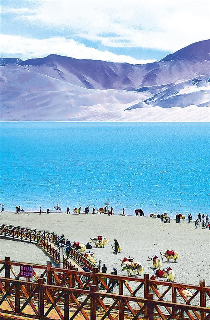 5月26日,新疆阿克陶县境内白沙湖,碧波荡漾,水天一色,吸引众多游客前来观赏打卡。程亚男摄(中经视觉)