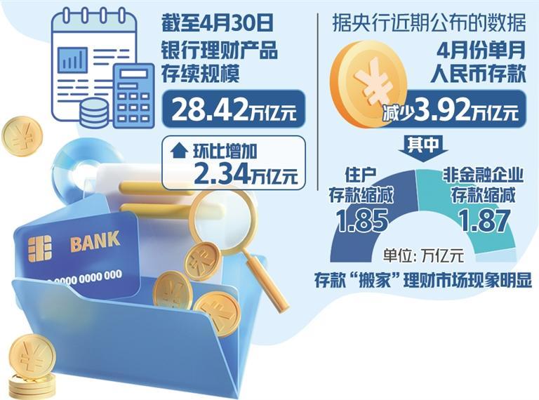 近日,普益标准发布数据显示,截至4月30日,银行理财产品存续规模为28.42万亿元,环比增加2.34万亿元。与此同时,据央行近期公布的数据,4月单月人民币存款减少3.92万亿元。其中,住户存款缩减了1.85万亿元,非金融企业存款缩减了1.87万亿元。存款“搬家”理财市场现象明显。