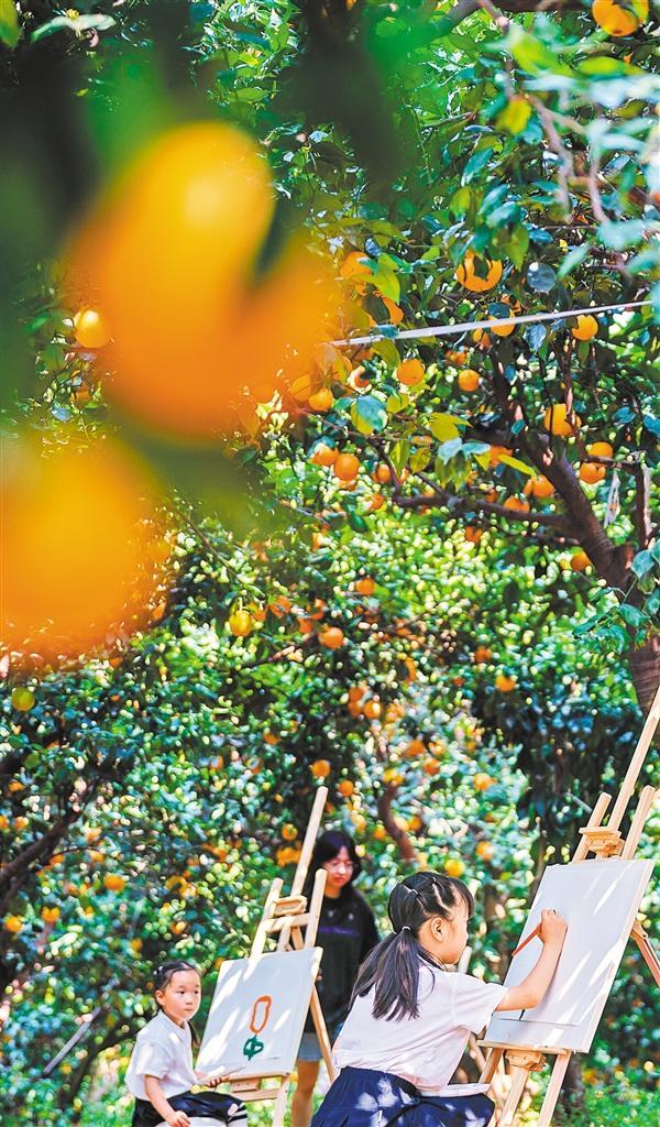 ◀5月22日,四川省眉山市黄丰镇柑橘林,美术社团学生开展户外写生。“研学+”带动乡村游,激发市场活力。