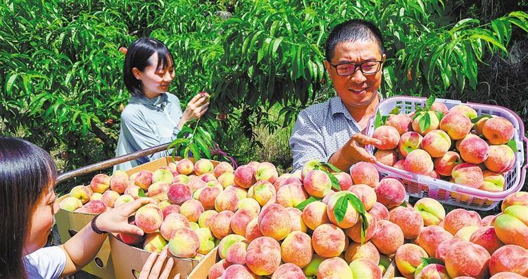 ▶5月24日,湖北省兴山县昭君镇大礼村桃园,游客和果农在采摘桃子。当地大力发展休闲采摘乡村游。
