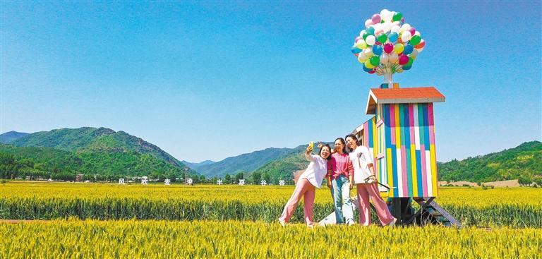 ▼5月22日,游客在河南省栾川县潭头镇大王庙村麦田游玩。当地提升乡村旅游的内涵,在麦田里搭建栈道、摆放景观,让游客体验农田、回归自然。