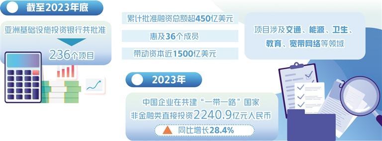 据统计,截至2023年底,亚投行共批准了236个项目,累计批准融资总额超过450亿美元,带动资本近1500亿美元,惠及36个成员,项目涉及交通、能源、卫生、教育、宽带网络等多个领域。与此同时,共建“一带一路”倡议也获得越来越多国家和地区的支持。2023年,中国企业在共建“一带一路”国家非金融类直接投资2240.9亿元人民币,同比增长28.4%。