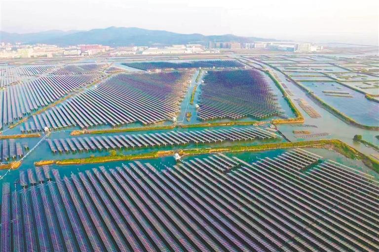 走进珠海市金湾区三灶镇鱼林村光伏发电项目现场,一排排鳞次栉比的光伏板在阳光照射下熠熠闪光,像一片片黑色的鳞片镶嵌在水面上,原来的“万顷碧波”现已变为“发电工坊”。