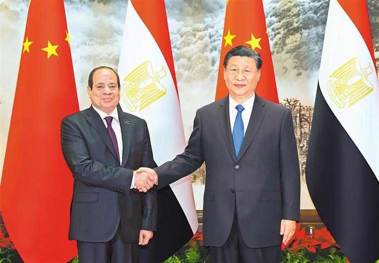 习近平指出,68年前,埃及在阿拉伯和非洲国家中率先同新中国建交。任凭国际形势风云变幻,两国始终相互信任、真诚合作、携手发展。今年是中埃建立全面战略伙伴关系10周年。10年来,我同塞西总统共同引领双边关系蓬勃发展。中埃关系已经成为中国同阿拉伯、非洲、伊斯兰和发展中国家团结协作、互利共赢的生动写照。新形势下,建设更具内涵、更有活力的中埃关系,符合两国人民共同期待。中方愿同埃方不断深化互信,推进合作,构建面向新时代的中埃命运共同体,为地区乃至世界和平、稳定、发展、繁荣贡献力量。