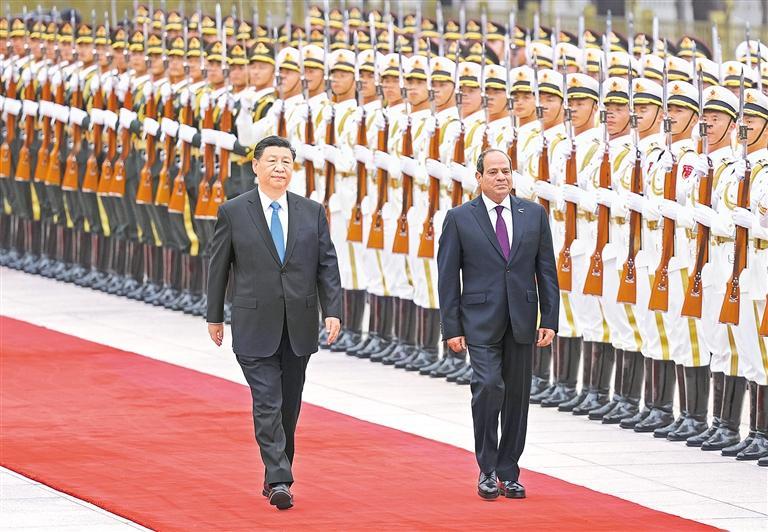 塞西抵达时,礼兵列队致敬。两国元首登上检阅台,军乐团奏中埃两国国歌,天安门广场鸣放21响礼炮。塞西在习近平陪同下检阅中国人民解放军仪仗队,并观看分列式。