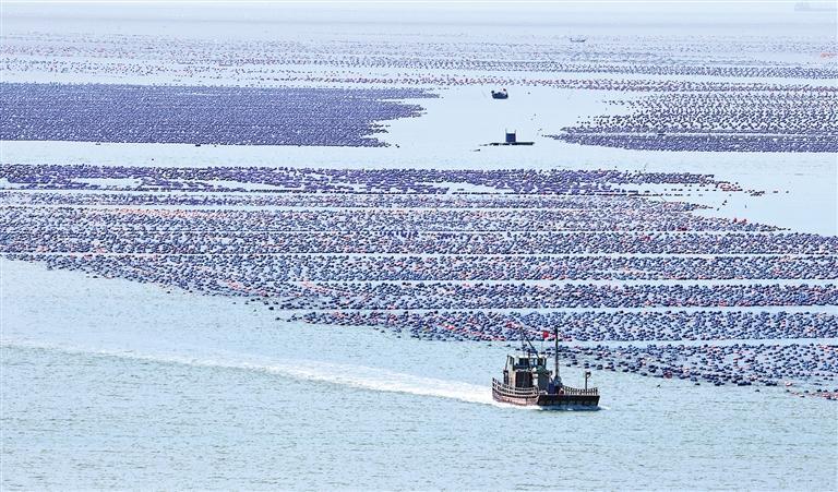 5月29日,福建福州连江县定海湾海域的海洋牧场,渔民驾驶养殖船在海面上开展“夏管”作业。王旺旺摄(中经视觉)