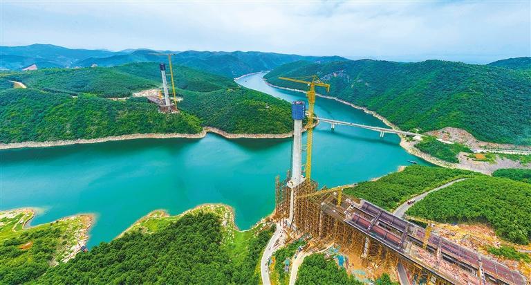 六月四日,河南渑淅(渑池—淅川)高速丹江小三峡特大桥南主塔正紧张施工,大桥主塔正式进入封顶施工阶段。大桥建成后,河南淅川到湖北丹江口的通行时间可压缩一小时以上。聂冬晗摄(中经视觉)