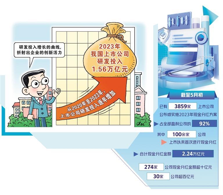 上市公司积极回应投资者所呼,分红意愿及能力不断提升。中国上市公司协会统计数据显示,截至5月初,已有3859家上市公司公布或实施2023年现金分红方案,占全部盈利公司的92%,其中100余家公司上市以来首次进行现金分红;合计现金分红金额2.24万亿元。274家公司现金分红金额超10亿元,30家公司超100亿元。