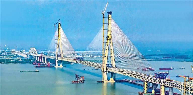 6月9日,常泰长江大桥建设作业现场。当日,随着主航道桥钢桁梁合龙段焊缝焊接完成,常泰长江大桥顺利合龙,预计明年4月底前具备通车条件。汤德宏摄(中经视觉)
