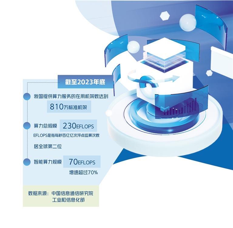 随着数字技术向经济社会各领域全面持续渗透,数据已经成为与土地、劳动力、资本、技术并列的一大生产要素,与之相关的存储、计算、传输、应用等算力需求将大幅提升,预计每年仍将以20%以上的速度快速增长。近年来,人工智能大模型发展迅猛,相关场景更加丰富,需要更加强大的算力支撑。算力已成为衡量国家经济发展程度的一项重要指标。根据《2021—2022全球计算力指数评估报告》显示,国家计算力指数与数字经济发展和GDP的走势呈现显著的正相关,从15个重点国家的计算力指数看,算力指数平均每提高1个点,数字经济规模和GDP将分别增长3.5‰和1.8‰。截至2023年底,我国提供算力服务的在用机架数达到810万标准机架,各类算力提供主体超5000家,算力总规模位居全球第二位,算力日益成为推动数字经济发展的重要驱动力。
