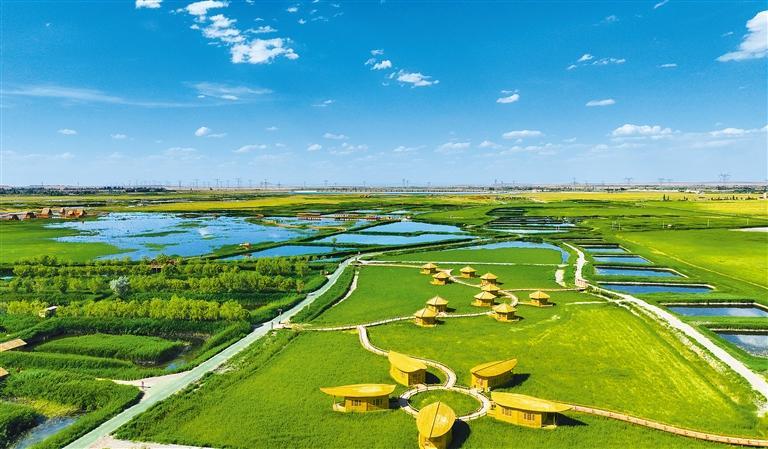 6月9日,俯瞰甘肃省酒泉市祁连苇海景区。景区内湿地星罗棋布,呈现出独特的戈壁绿洲湿地景观。曹红祖摄(中经视觉)